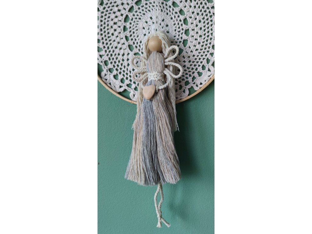 Ručně vyráběná macramé andělka z přírodních materiálů, tvořená s láskou a citem pro detail. Jemná závěsná dekorace, která vnese do vašeho domova harmonii, jemnost a příjemnou atmosféru. Ideální jako osobní talisman nebo milý dárek – připraveno k darování 🤍✨