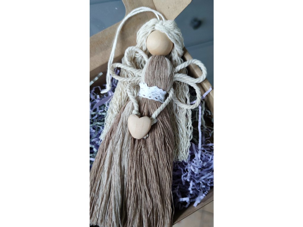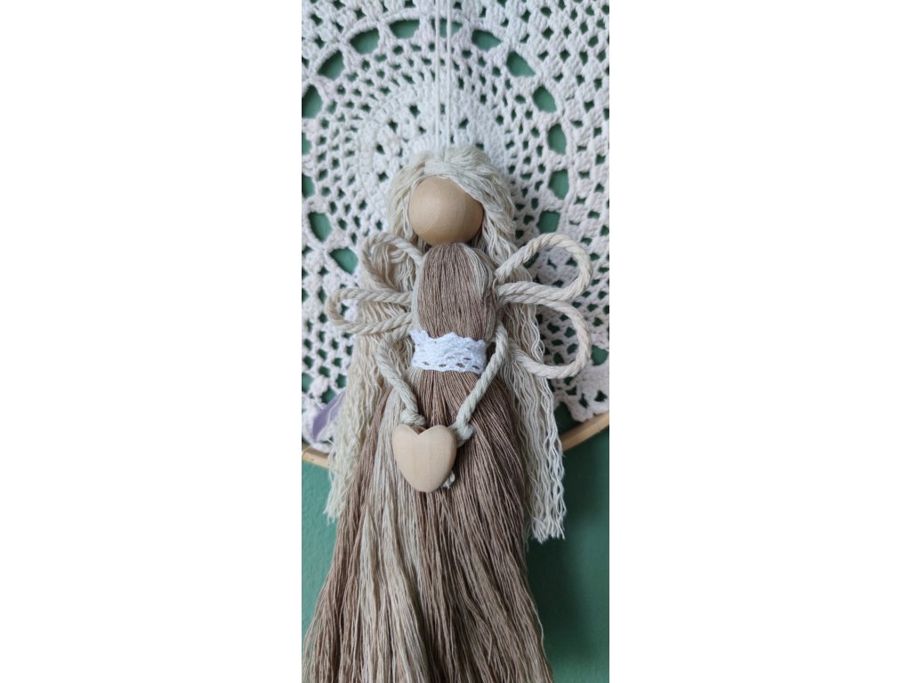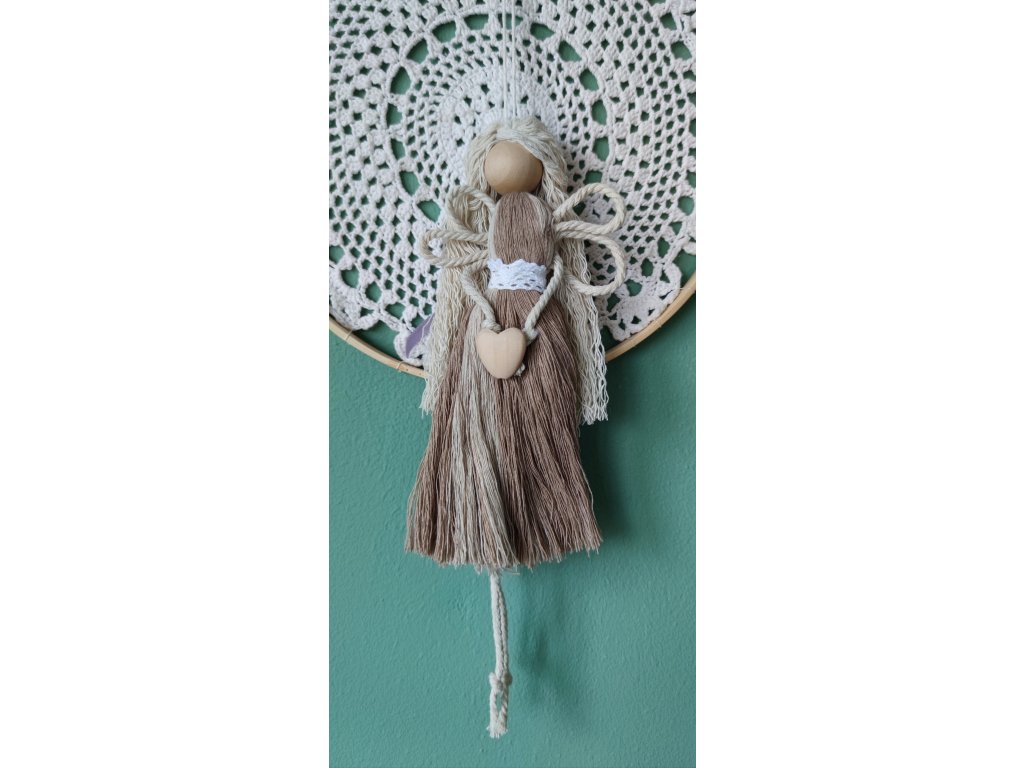 Ručně vyráběná macramé andělka z přírodních materiálů, tvořená s láskou a citem pro detail. Jemná závěsná dekorace, která vnese do vašeho domova klid, harmonii a pocit pohody. Skvělá jako osobní talisman nebo milý dárek – připraveno k darování 🤍✨
