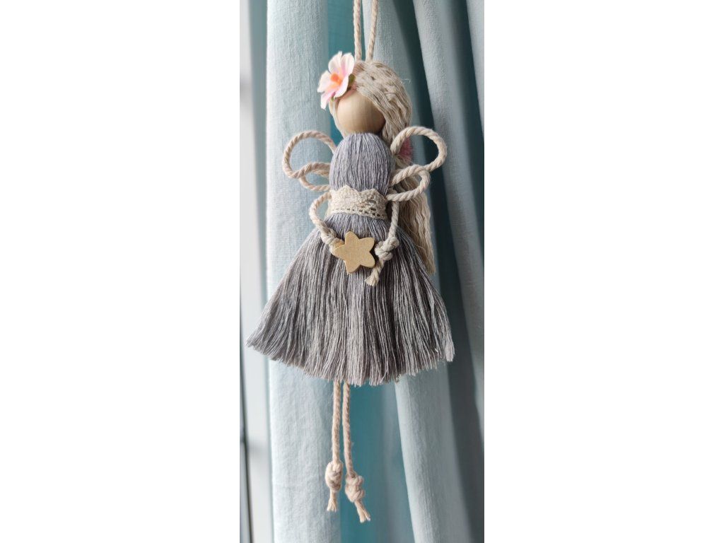 Ručně vyráběná macramé dekorace z přírodních materiálů, tvořená s láskou a citem pro detail. Jemná andělka působí čistě a étericky – jako ochranný talisman i krásný dárek.