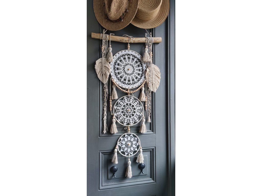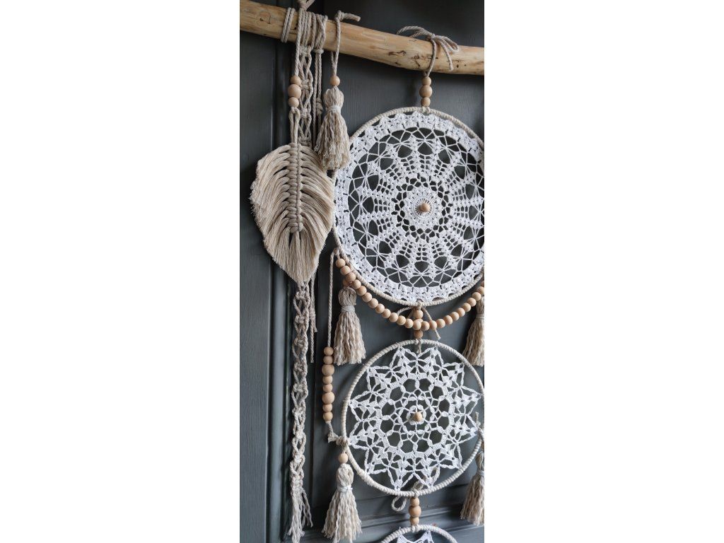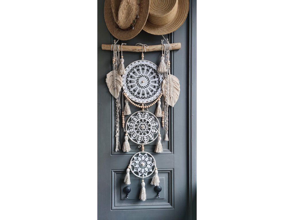 ✨ Jemná boho dekorace v bílo-krémových tónech, která do interiéru vnáší lehkost, klid a harmonii. Díky kombinaci vintage háčkované krajky, macramé prvků a přírodních materiálů působí přirozeně, vzdušně a nadčasově.