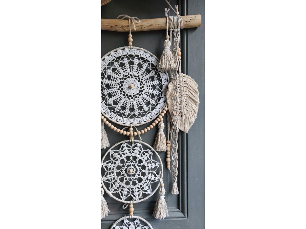 Dominantou dekorace jsou tři kruhy vyplněné háčkovanou krajkou v jemných bílých a krémových odstínech. Celek doplňují dřevěné korálky, bavlněné šňůry, macramé detaily a střapce, které dodávají dekoraci něžný boho charakter.