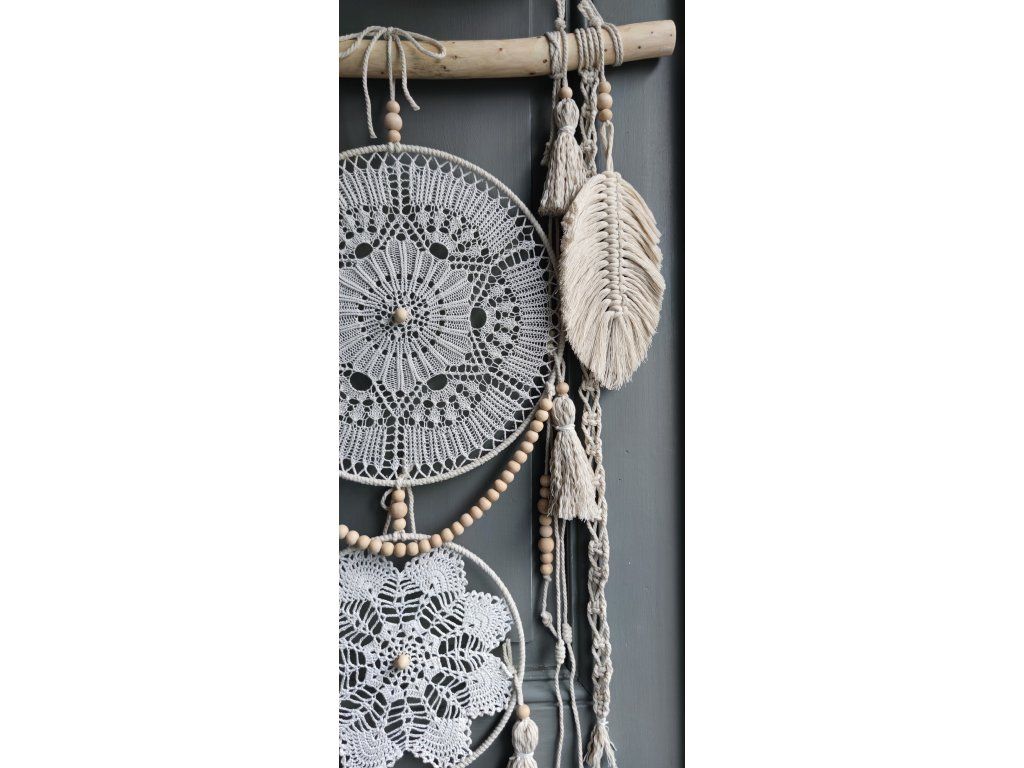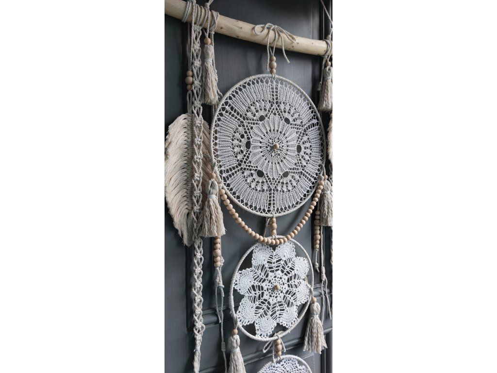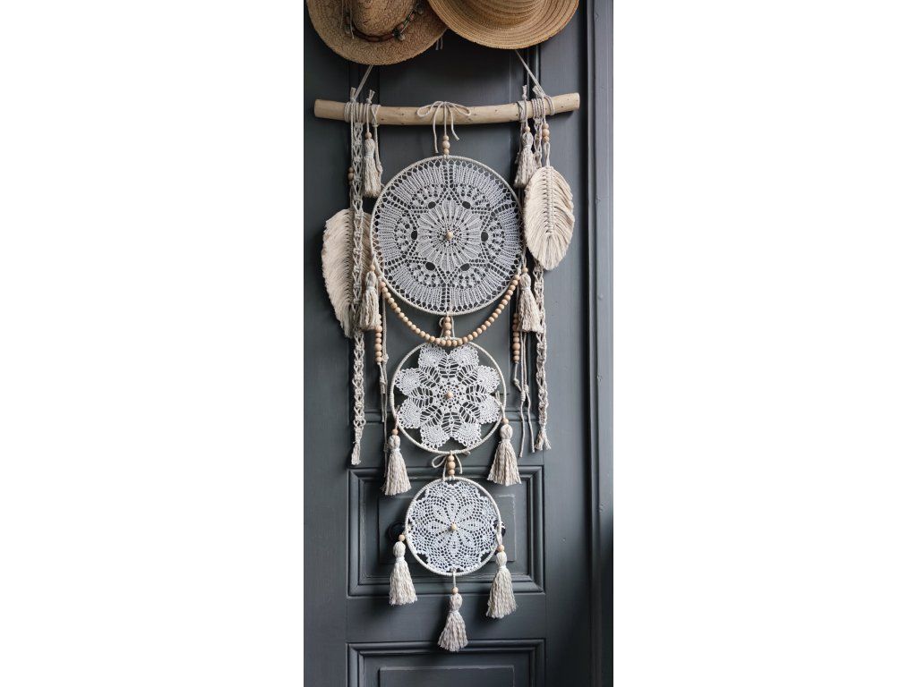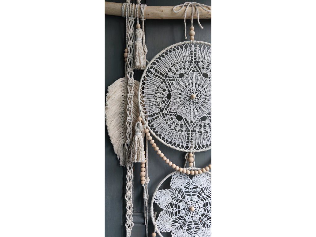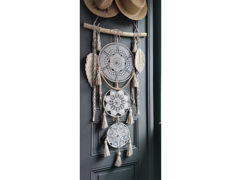 Dominantou dekorace jsou tři kovové kruhy vyplněné vintage háčkovanou krajkou v krémových odstínech. Celek je doplněn dřevěnými korálky, bavlněnými šňůrami, macramé detaily a jemnými přírodními peříčky, které dodávají dekoraci lehkost a přirozenou eleganci.