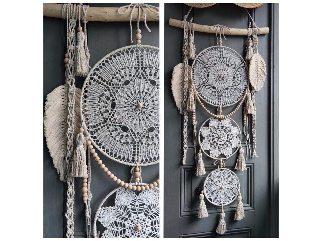 ✨ Jemná boho dekorace v čistě přírodních tónech, která vnáší do interiéru klid, rovnováhu a harmonii. Kombinuje starou háčkovanou krajku, macramé prvky a přírodní materiály v jejich nejpřirozenější podobě. Každý kus vzniká ručně s respektem k tradičním řemeslům a myšlence upcyklace – znovuvyužití krásných starých materiálů.