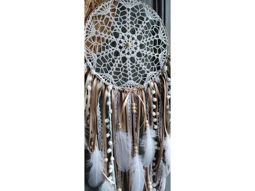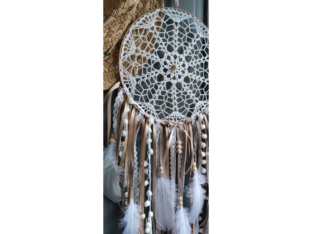 Lapač snů Andělská pírka v přírodních tónech přináší do interiéru jemnost, světlo a klidnou energii. Jeho střed tvoří detailně háčkovaná stará krajka, vypnutá v kovovém kruhu o průměru 25 cm, která působí elegantně a vzdušně.