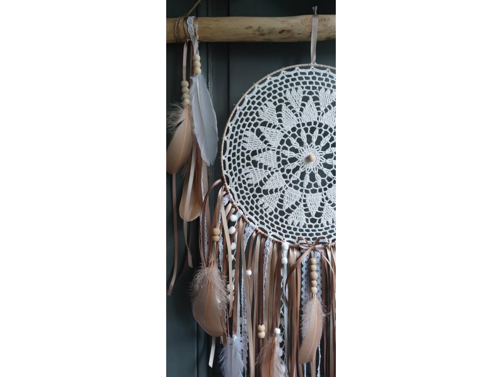 Z mandaly splývají taftové a atlasové stuhy, recyklovaná krajka, dřevěné korálky a přírodní barvené peří v tónech bílé, béžové, krémové a světle hnědé. Celek působí lehce, vzdušně a ukotveně zároveň – jako spojení písku, dřeva a jemného větru.