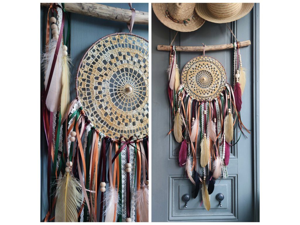 Barevná kombinace bordó, okrové, zelené a jemných neutrálních tónů přináší do prostoru teplo, hloubku a pocit bezpečí. Dominantou je ručně háčkovaný bavlněný střed zasazený do kovového kruhu, který je zavěšen na přírodním opracovaném klacíku ošetřeném voskem 🌿