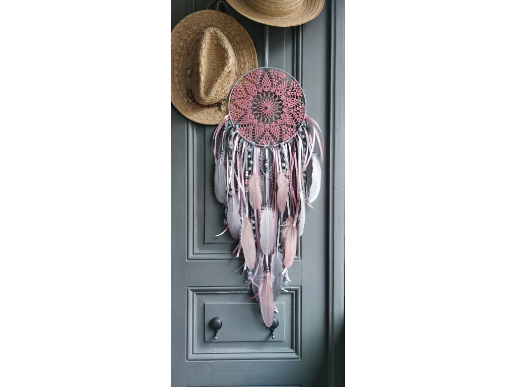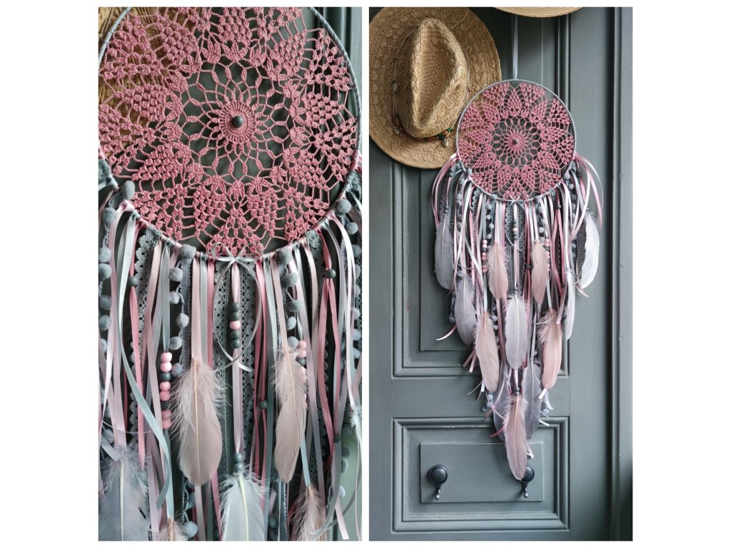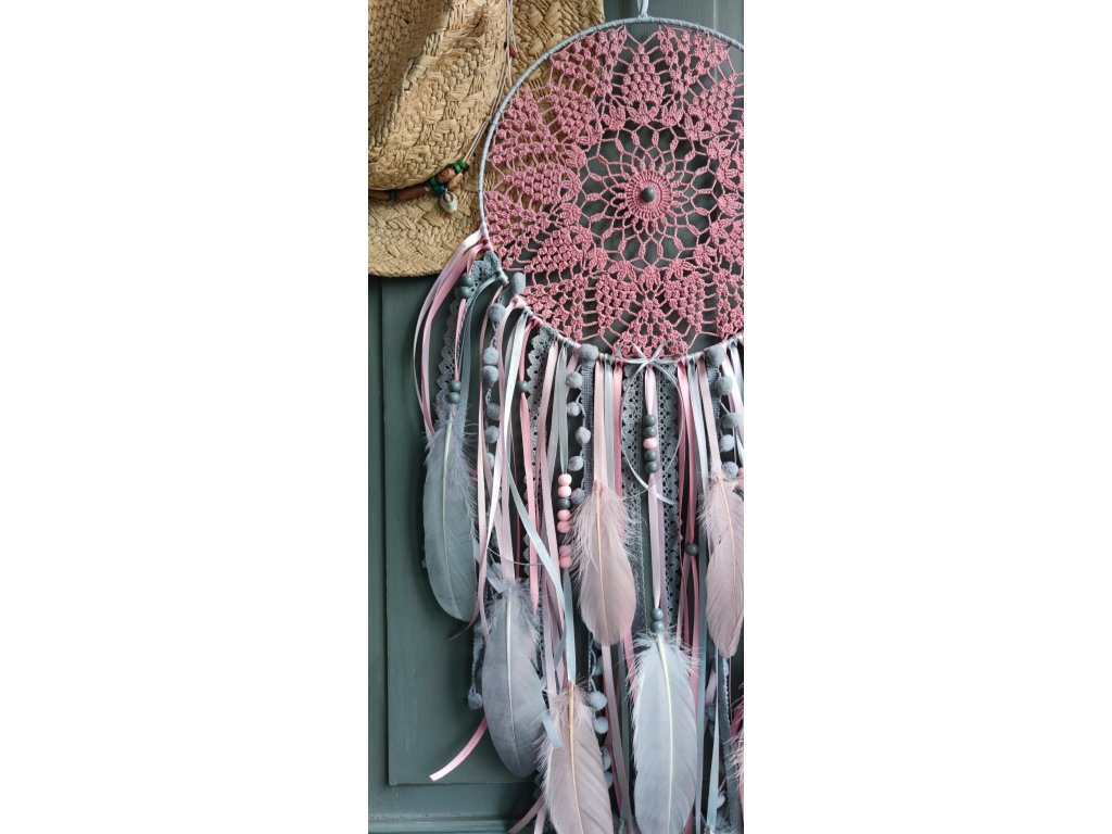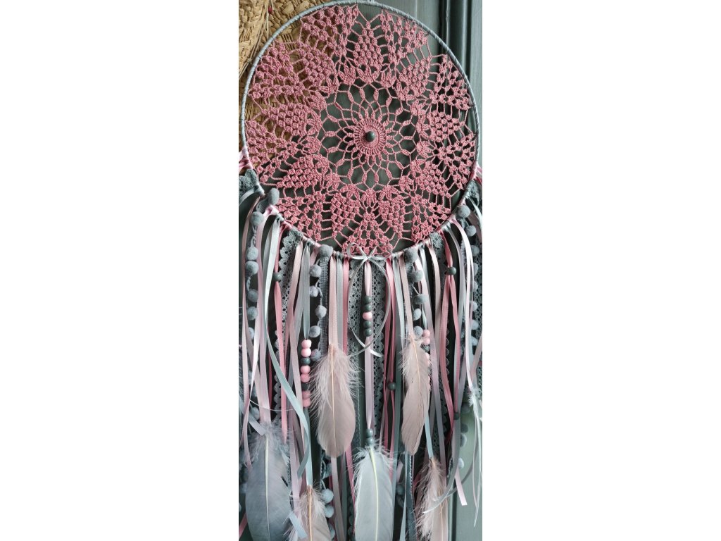 Lapač snů Měsíční hedvábí působí něžně, snově a velmi harmonicky. Kombinace pudrových růžových tónů se šedou a stříbrně šedou evokuje měsíční světlo, klid noci a jemnou ženskou energii 🌙. Každý kus je ručně tvořený originál, ve kterém se snoubí krajka, peří a stuhy do elegantního boho celku.