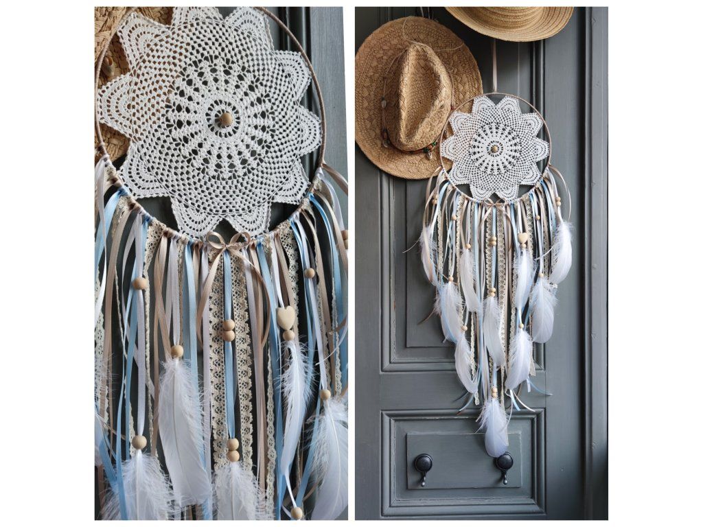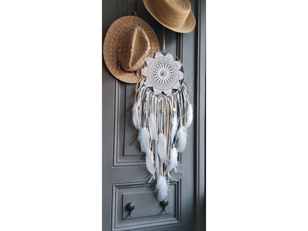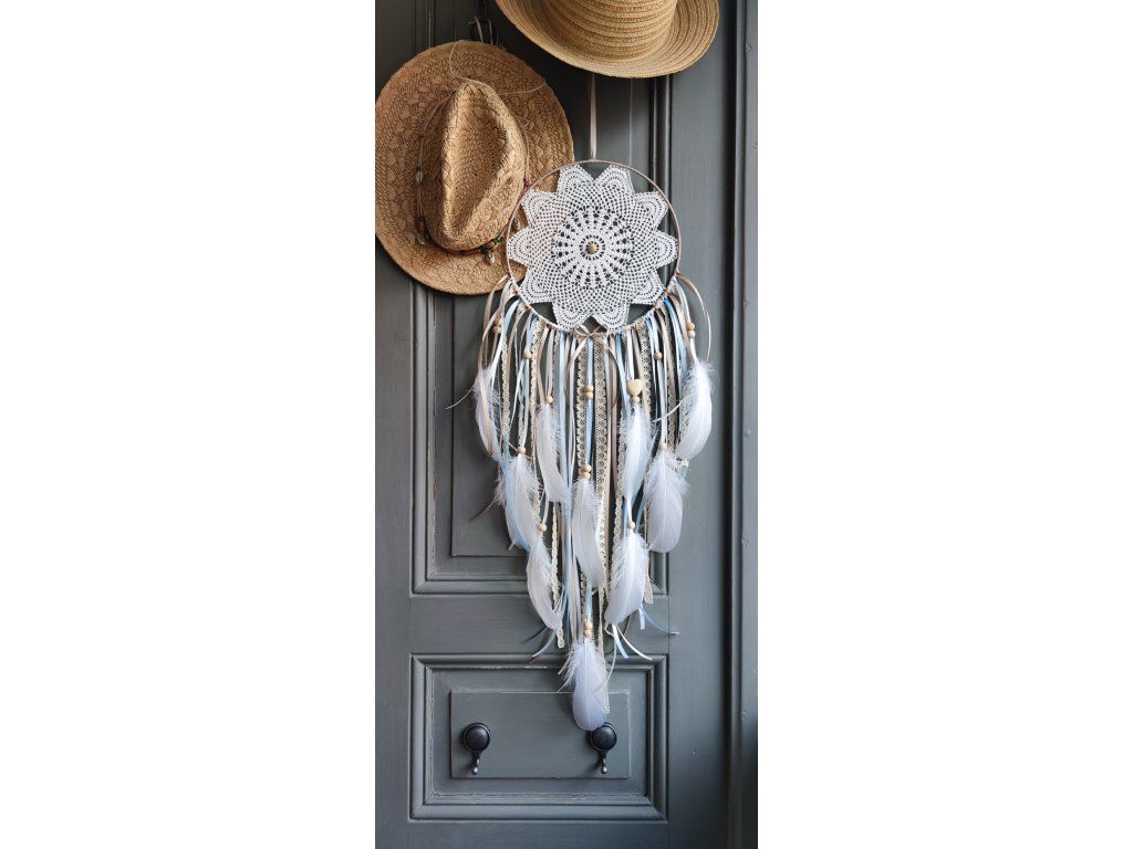 Dominantou jsou vrstvy bavlněné krajky, které dodávají lapači jemný a elegantní charakter ✨