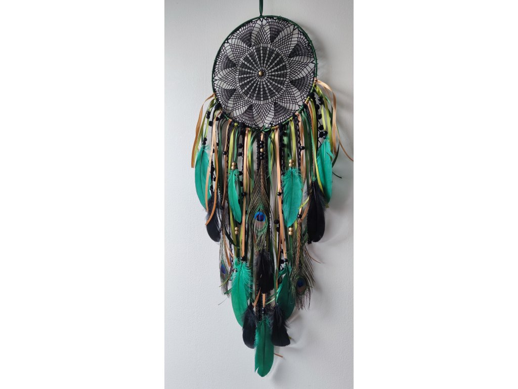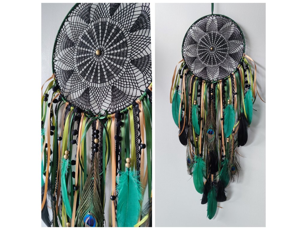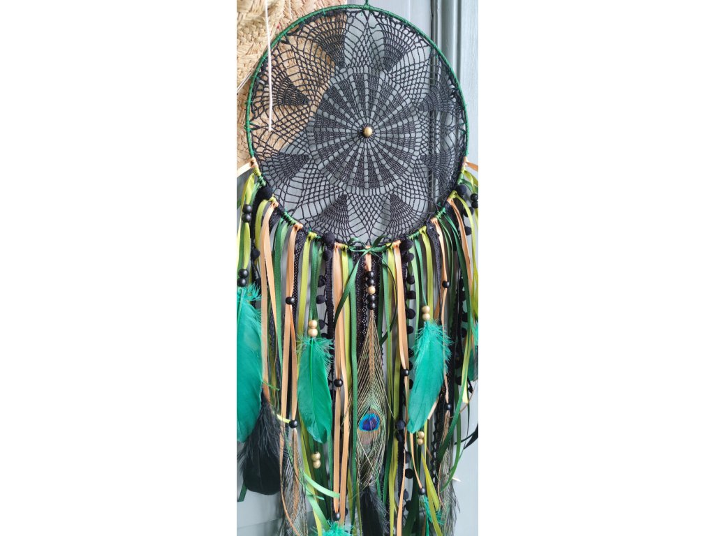 Tón zelené mechové a limetkové barvy evokuje svěžest lesa a vitalitu přírody, zatímco černé a zlatavé detaily dodávají celku hloubku a noblesu. Lapač je zdobený peřím pávím, které mu přidává exotický nádech, a dřevěnými korálky, jež podtrhují přírodní charakter.